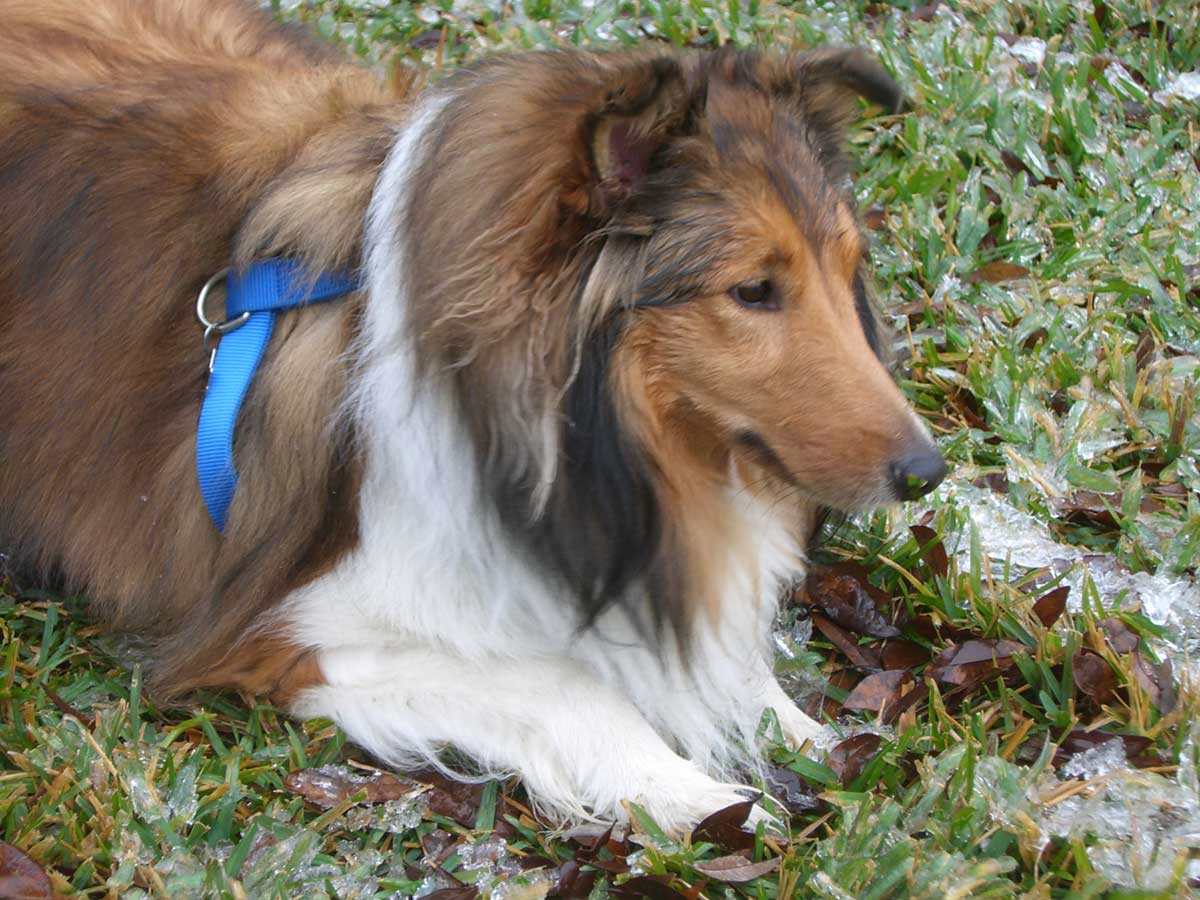 In his element - he decided to stretch out on our icy lawn after a recent (and rare) ice storm in Austin. He likes the cold! When its not icy, we let him run and chase the squirrels in the fenced-in field behind our shop. Note the ice is on green grass! |